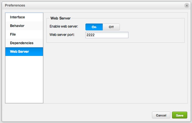 Architect can also deploy its own lightweight webserver. This is primarily for users that are doing proof of concept projects or are just getting started and do not have a server environment already set up. You can find the preferences for the web server under Preferences -> Web Server. You can enable or disable it, as well as change the designated port number.