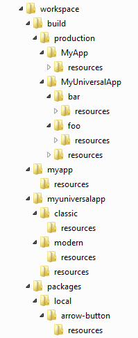 Similar to the "output" configuration from "app.json", the above determines where package resources are copied during a package build. The "resources" object is not present by default in "package.json", but behaves as if this were present: