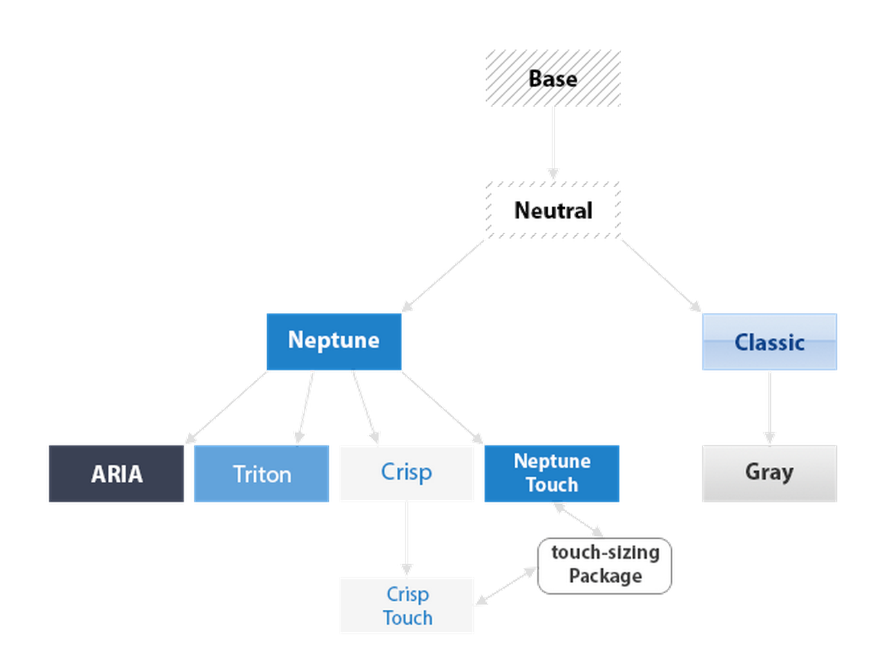 All Sencha theme packages are part of a larger hierarchy of themes. Each theme package extends a parent or base theme. The next step in creating your custom theme is to select which theme to extend. Ext JS ships with several themes for each toolkit: