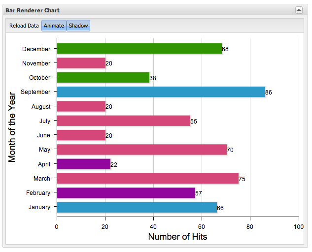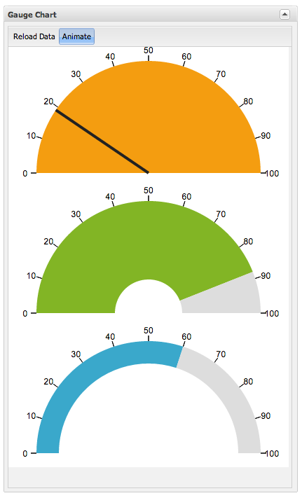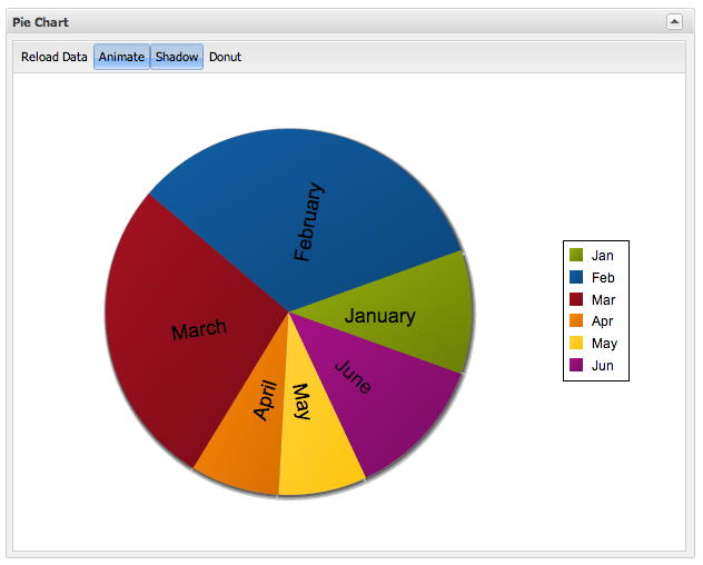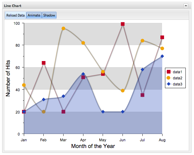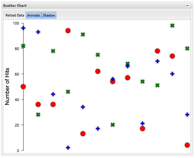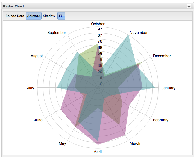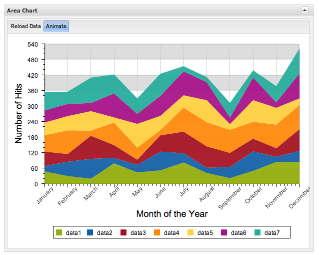 Charts are defined by the series which consist of AbstractPieSeries, AreaSeries, BarSeries, GuageSeries, MultipleColorSeries, PieSeries, LineSeries, RadarSeries, ScatterSeries and Series. Multiple series can be intermixed in a chart.