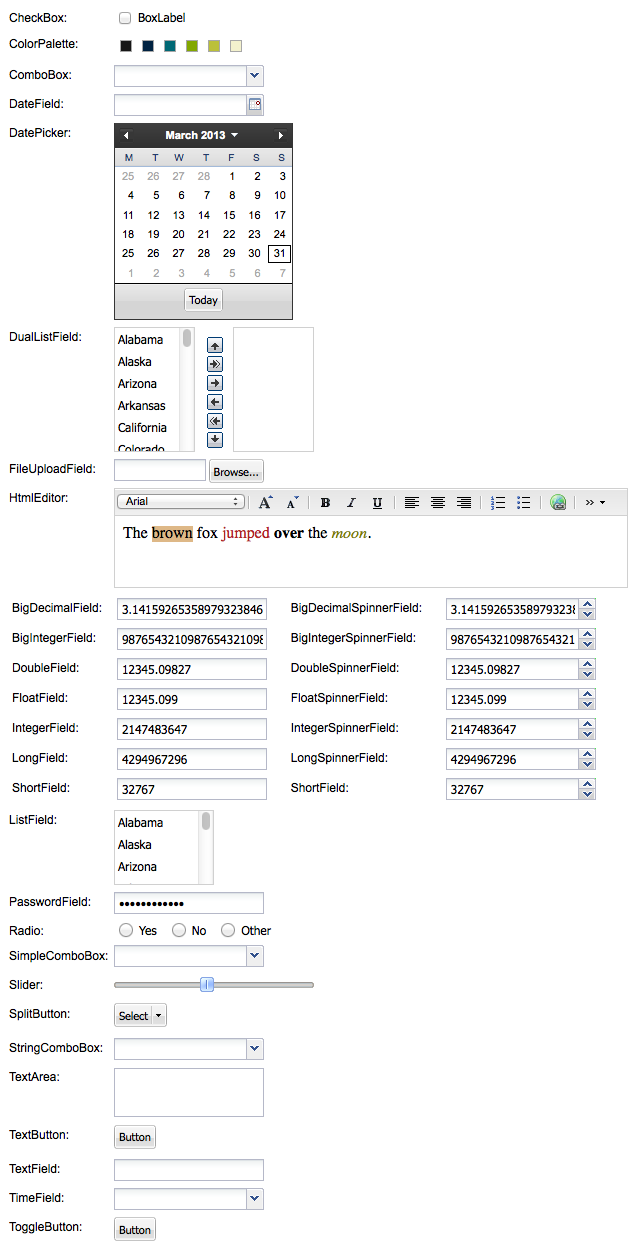 The available GXT field widget options.