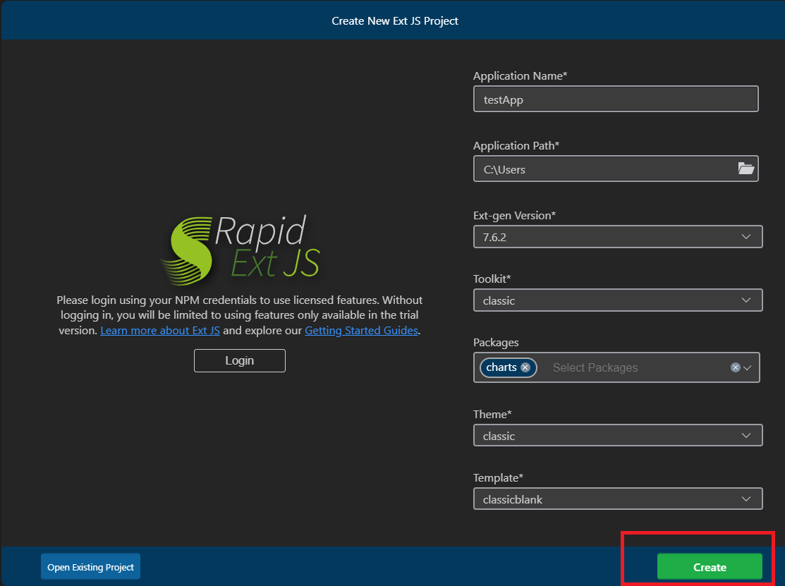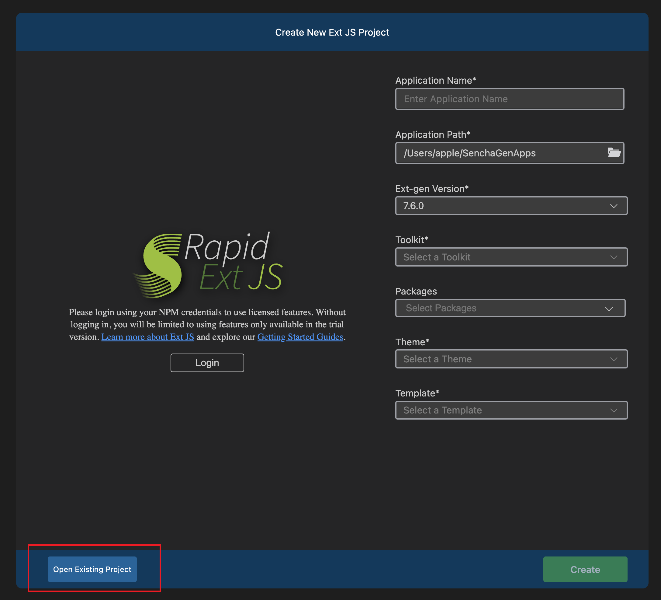 If you logged in through the npm registry, before installing the Rapid Ext JS extension, you will see logged-in user details on the extension (refer to the screenshot below, showing login.) For Rapid Ext JS Beta, request to do logout and login again through the Extension feature for the first time. This will set the npm path to test.npm.sencha.com